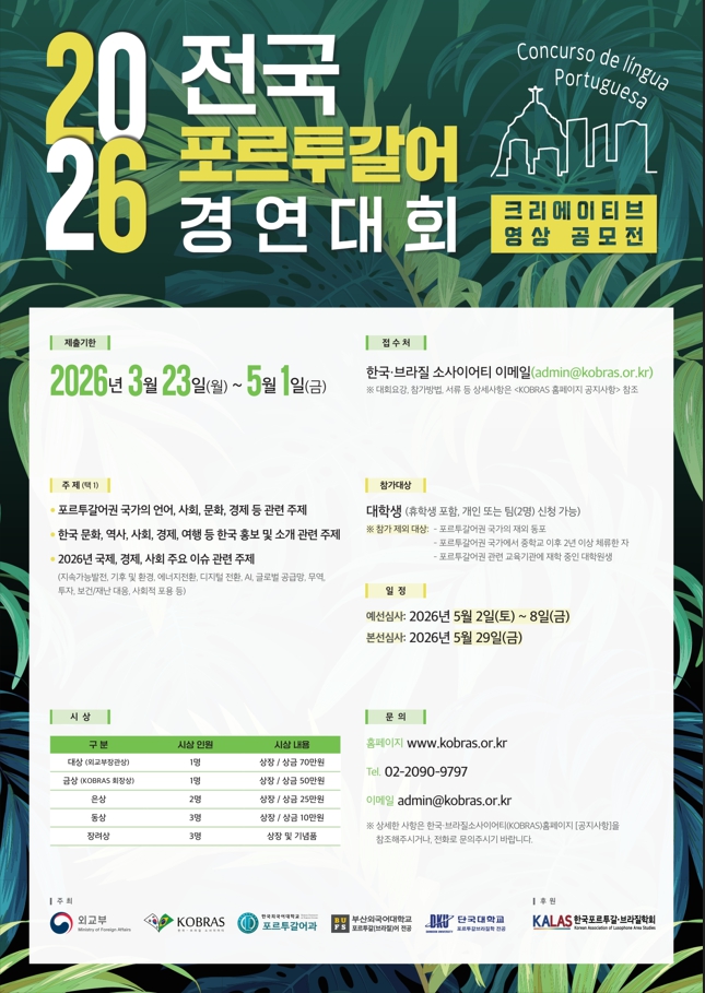 한국·브라질소사이어티(KOBRAS)는 외교부, 한국외국어대학교, 부산외국어대학교, 단국대학교, 한국포르투갈·브라질학회와 공동으로 포르투갈어권 국가와 관련된 주제나 내용, 또는 한국 소개 등의 영상물을 포르투갈어로 제작·발표하는 경연대회를 주최합니다. 입상한 작품은 한국·브라질소사이어티의 홈페이지와 SNS을 통해 활용하여 포르투갈어권 국가와 한국과 관련된 다양한 정보를 국내와 포르투갈어권 국가에 확산하려 합니다. 대학생 여러분들의 많은 관심과 참여 부탁드립니다.