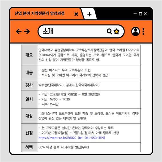 한국·브라질 소사이어티(KOBRAS)는 단국대학교 유럽중남미학부 포르투갈브라질학전공과 공동으로 대학생 및 일반인을 대상으로 「2023 하반기 지역전문가 과정 강좌」를 개설합니다.